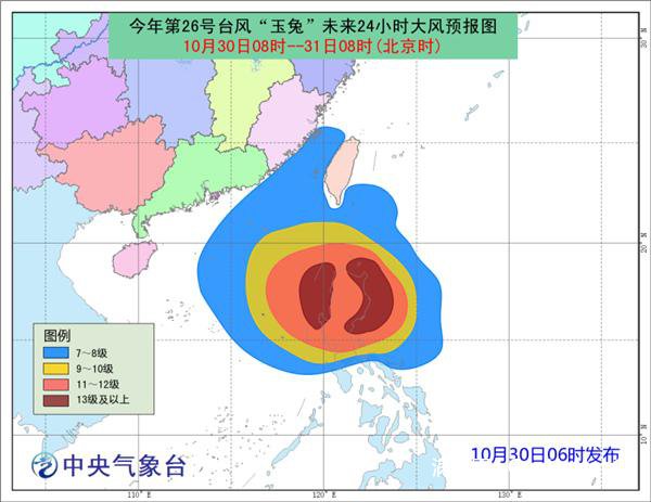 预计,“玉兔”中心将以每小时20公里左右的速度向偏西方向移动,穿过菲律宾吕宋岛后于今日傍晚前后进入南海东部海域,未来12小时内其强度逐渐减弱,以后强度维持或略有增强。11月1日开始转向偏北方向移动,移速减慢,强度明显减弱。 受“玉兔”和冷空气共同影响,30日08时到31日08时,台湾以东洋面、巴士海峡、南海中东部和东北部、台湾海峡有7-9级大风,阵风10-11级,其中南海东部的部分海域、巴士海峡南部风力达10-12级,阵风13级,“玉兔”中心附近最大风力可达13-14级。 |